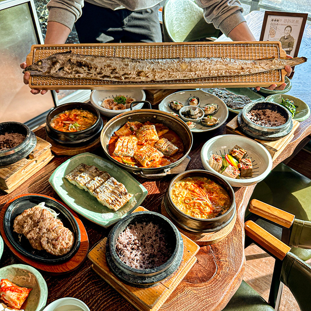 • 제주산 통갈치와 신선한 해산물 요리– 제주 대왕 통갈치구이 한상과 깊고 진한 국물의 갈치찌개가 대표 메뉴.