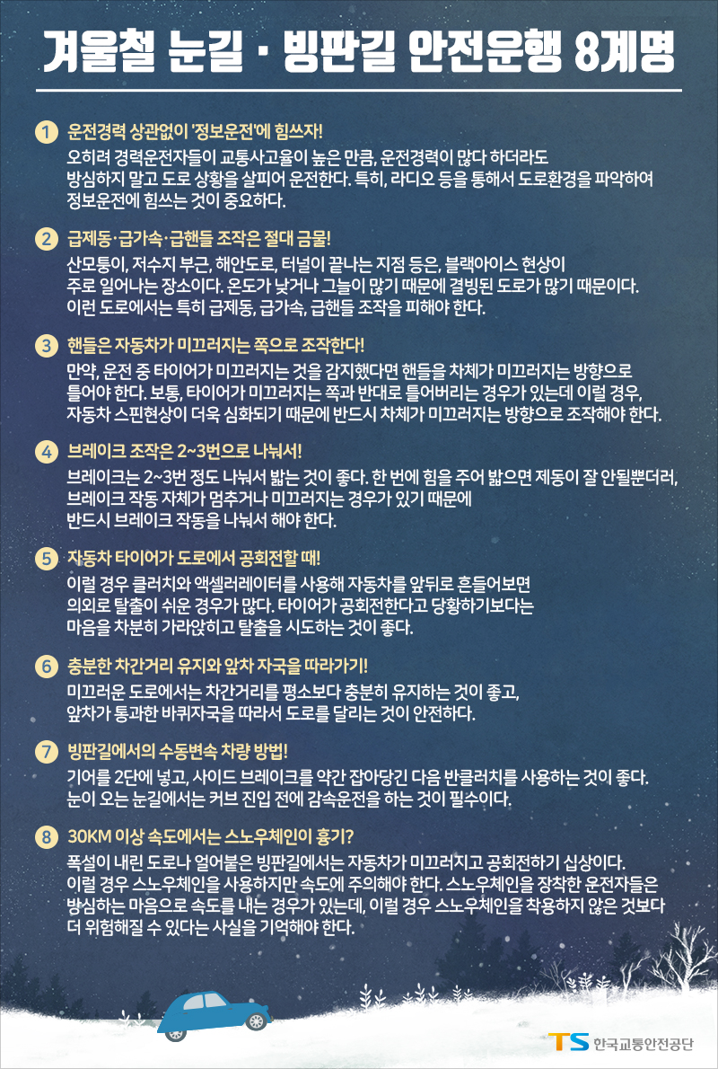 눈길에서는 차량이 쉽게 미끄러질 수 있기 때문에 급작스러운 제동, 가속, 핸들 조작을 피해야 합니다.