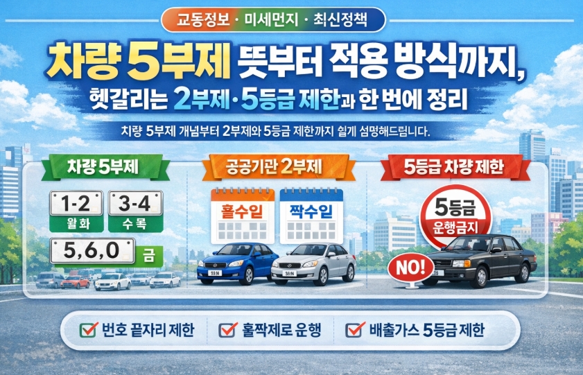 차량 5부제는 번호 끝자리를 기준으로 요일별 운행을 나누는 방식이지만, 2026년 현재 실제로 더 자주 적용되는 제도는 공공기관 차량 2부제와 배출가스 5등급 차량 제한입니다.