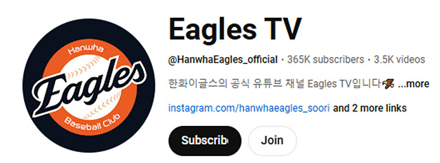 설명: 한화 이글스의 공식 유튜브 채널로, 경기 영상, 선수들의 일상, 팬 이벤트 등을 업로드합니다.